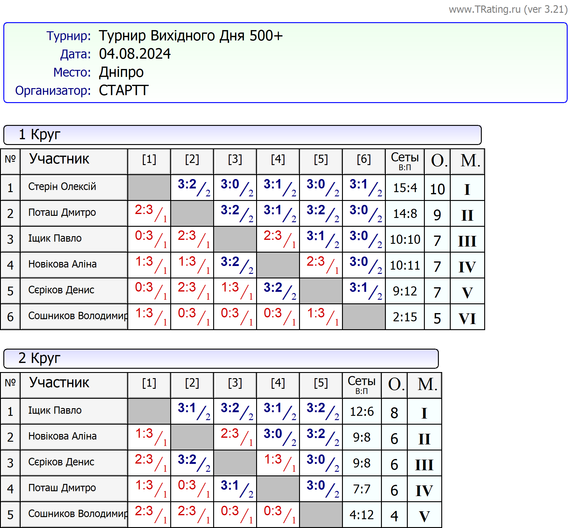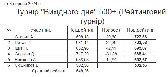 Результати турніру “Вихідного дня 500+ (Рейтинговий турнір)” за 4.08.2024