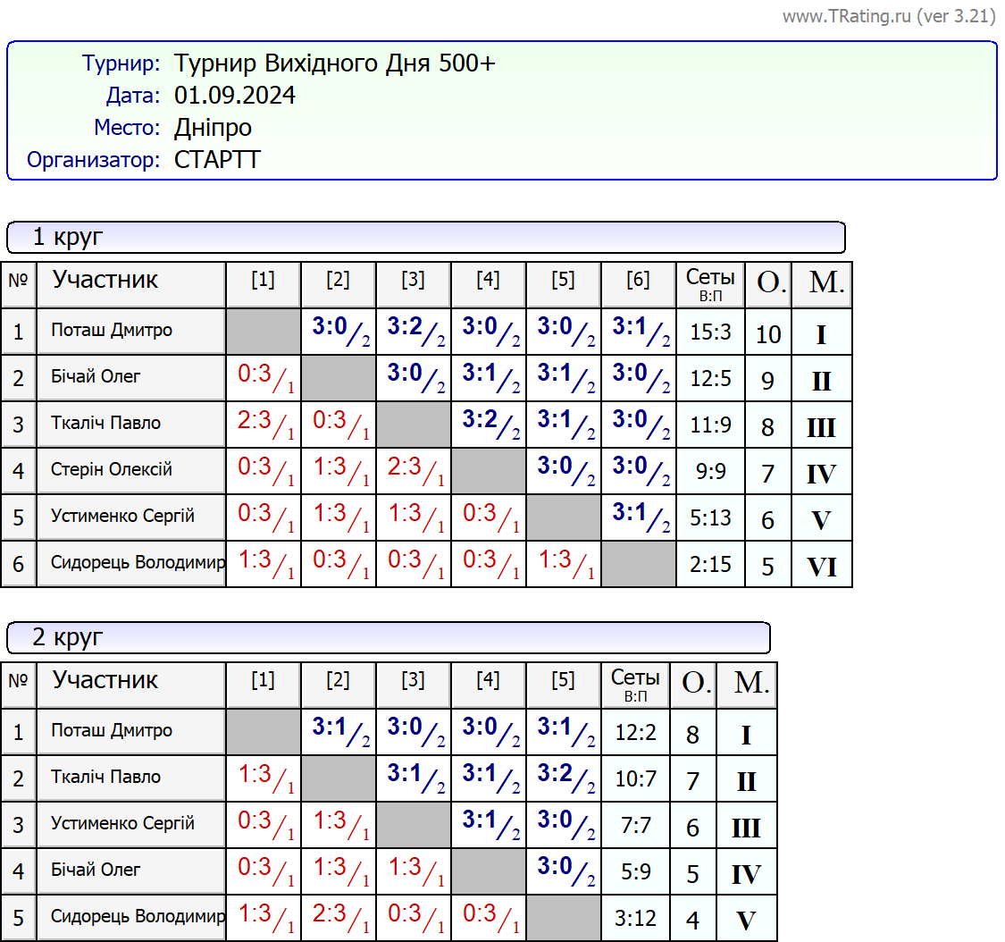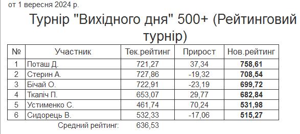 Результати турніру “Вихідного дня 500+ (Рейтинговий турнір)” за 1.09.2024