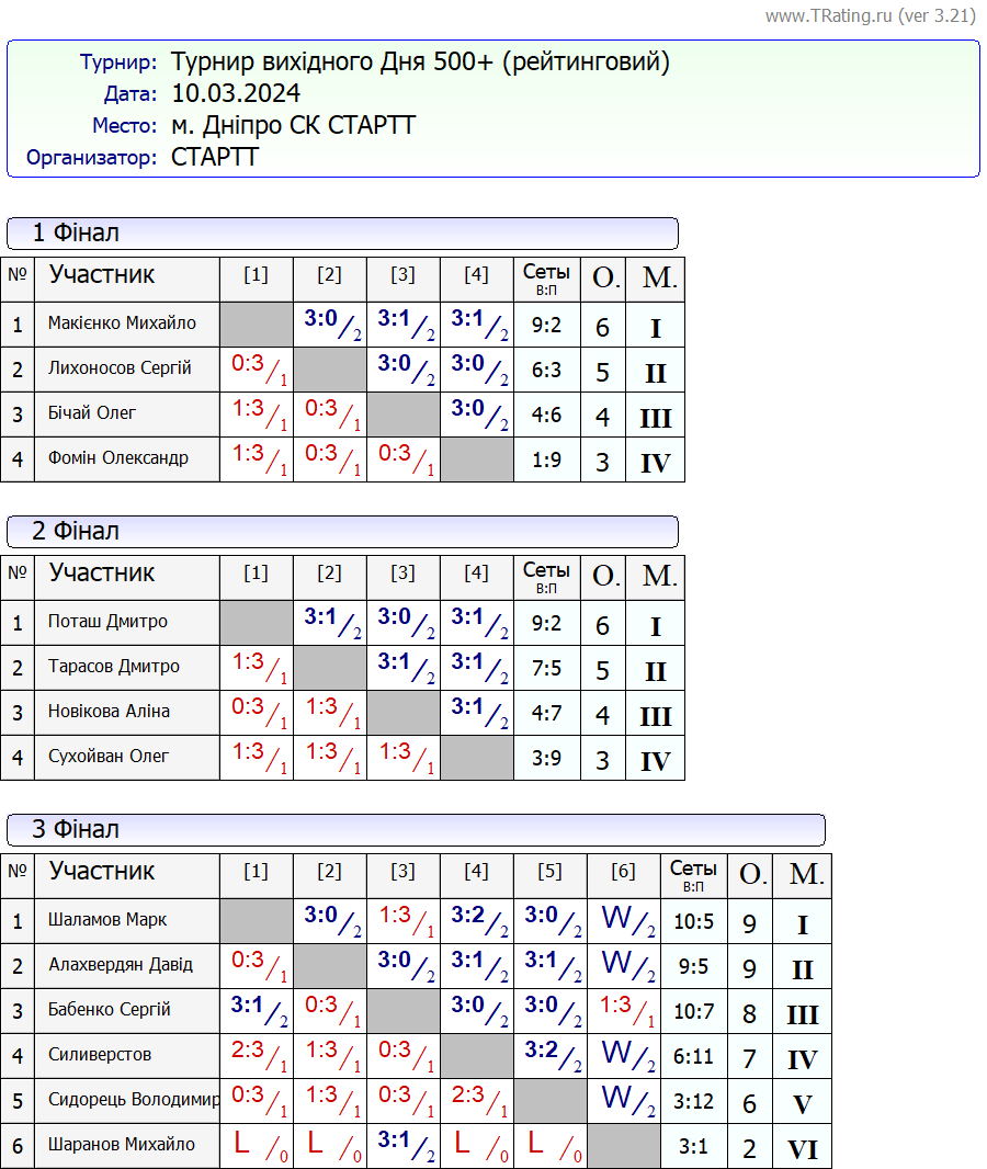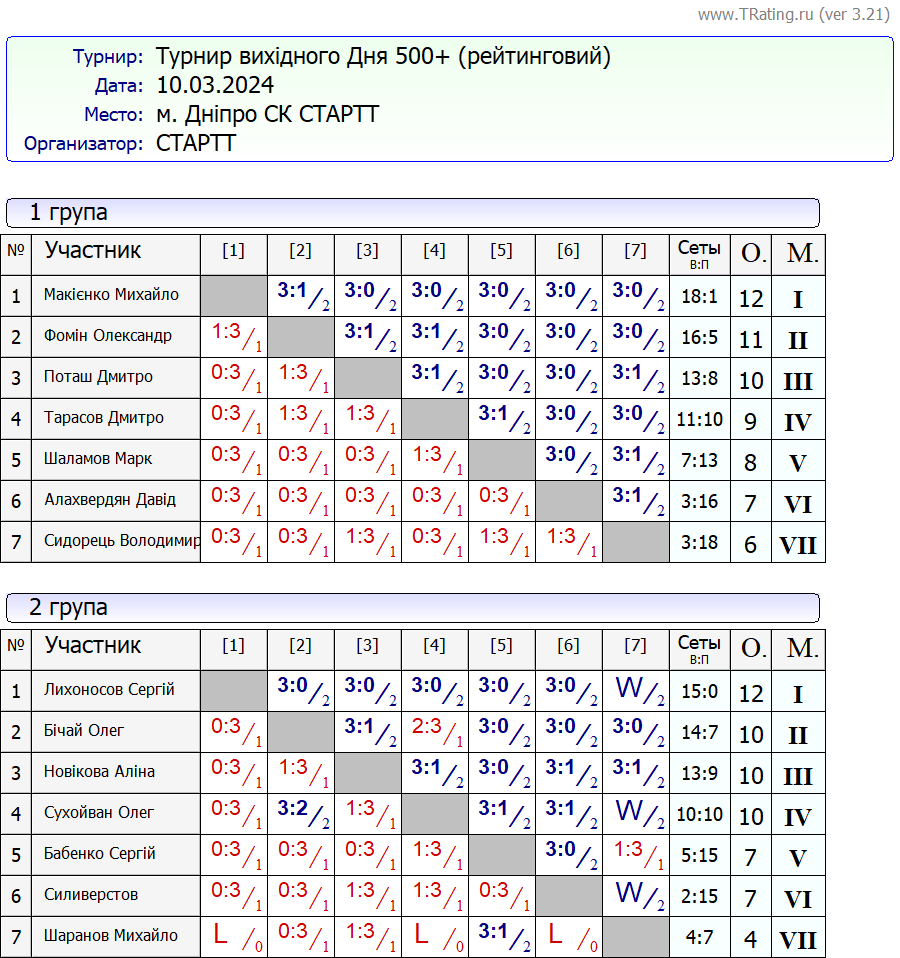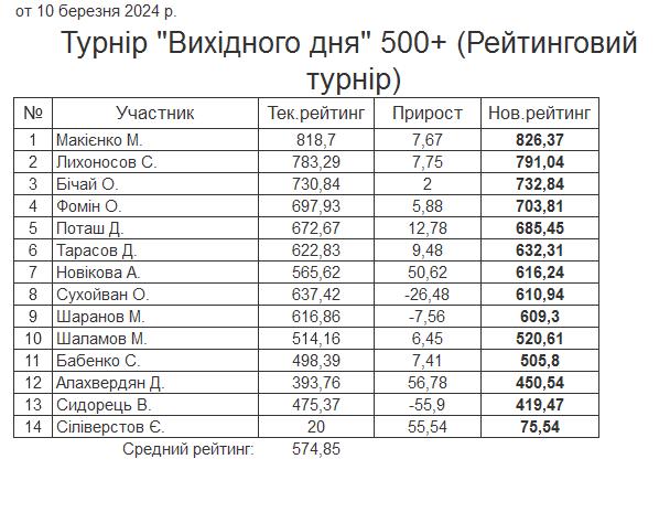 Результати турніру “Вихідного дня 500+ (Рейтинговий турнір)” за 10.03.2024