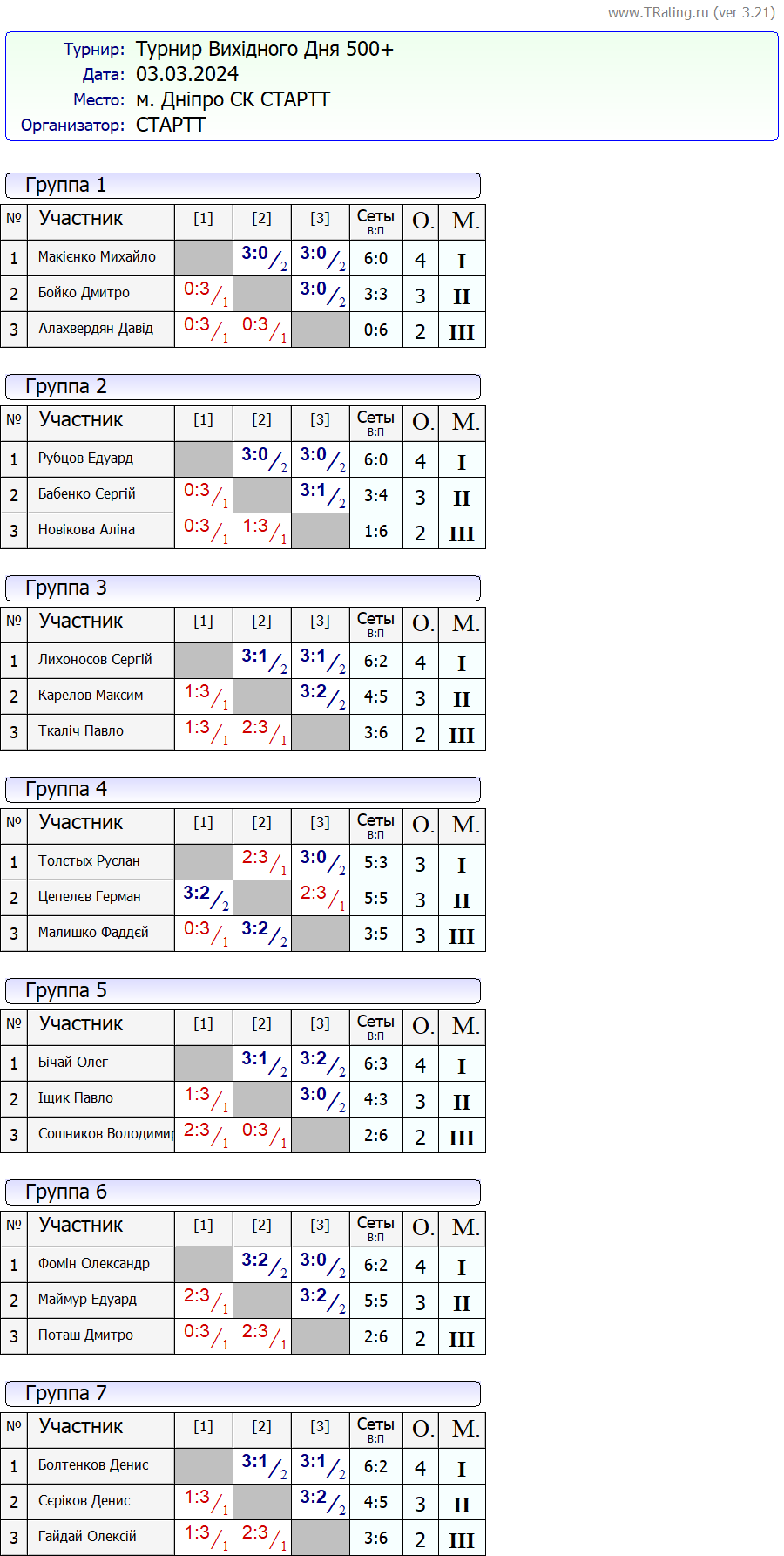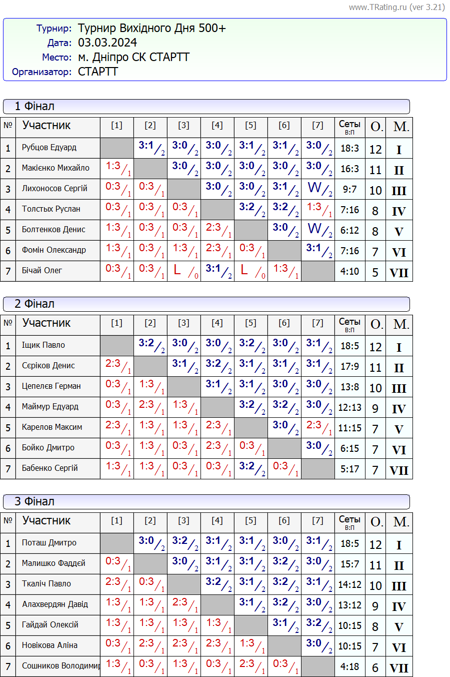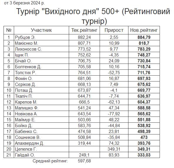 Результати турніру “Вихідного дня 500+ (Рейтинговий турнір)” за 03.03.2024