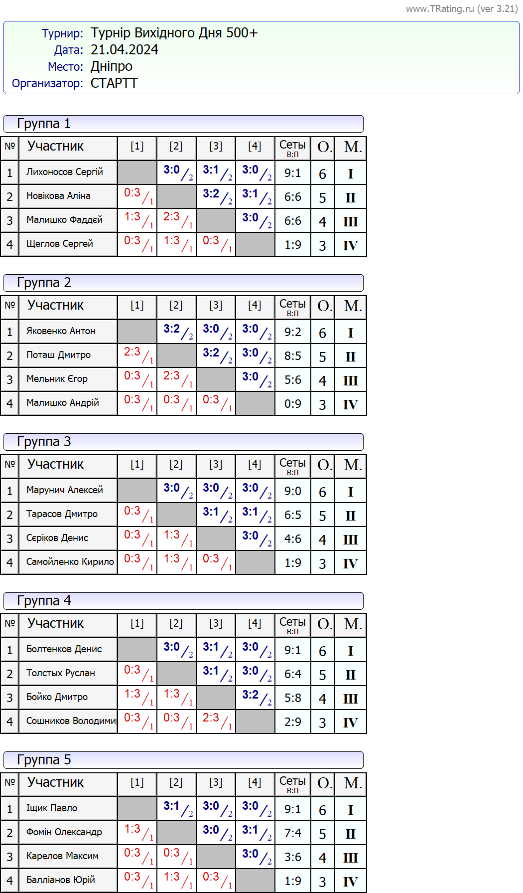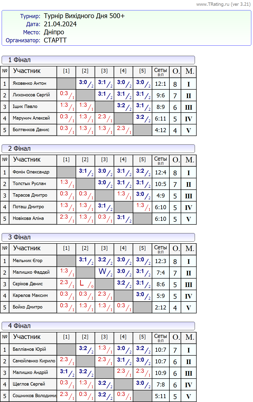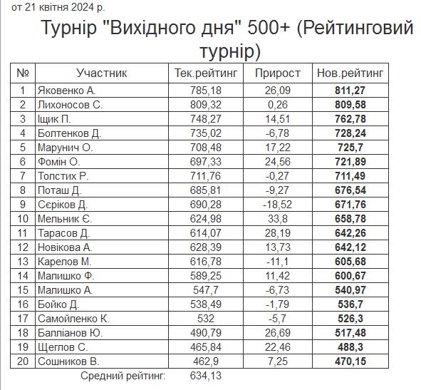 Результати турніру “Вихідного дня 500+ (Рейтинговий турнір)” за 21.04.2024