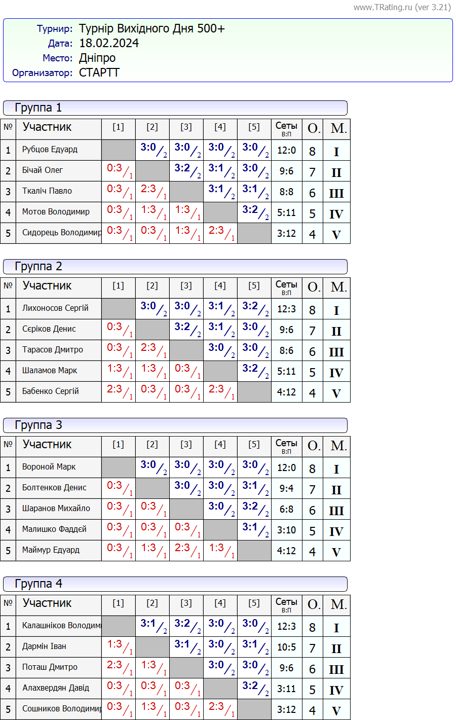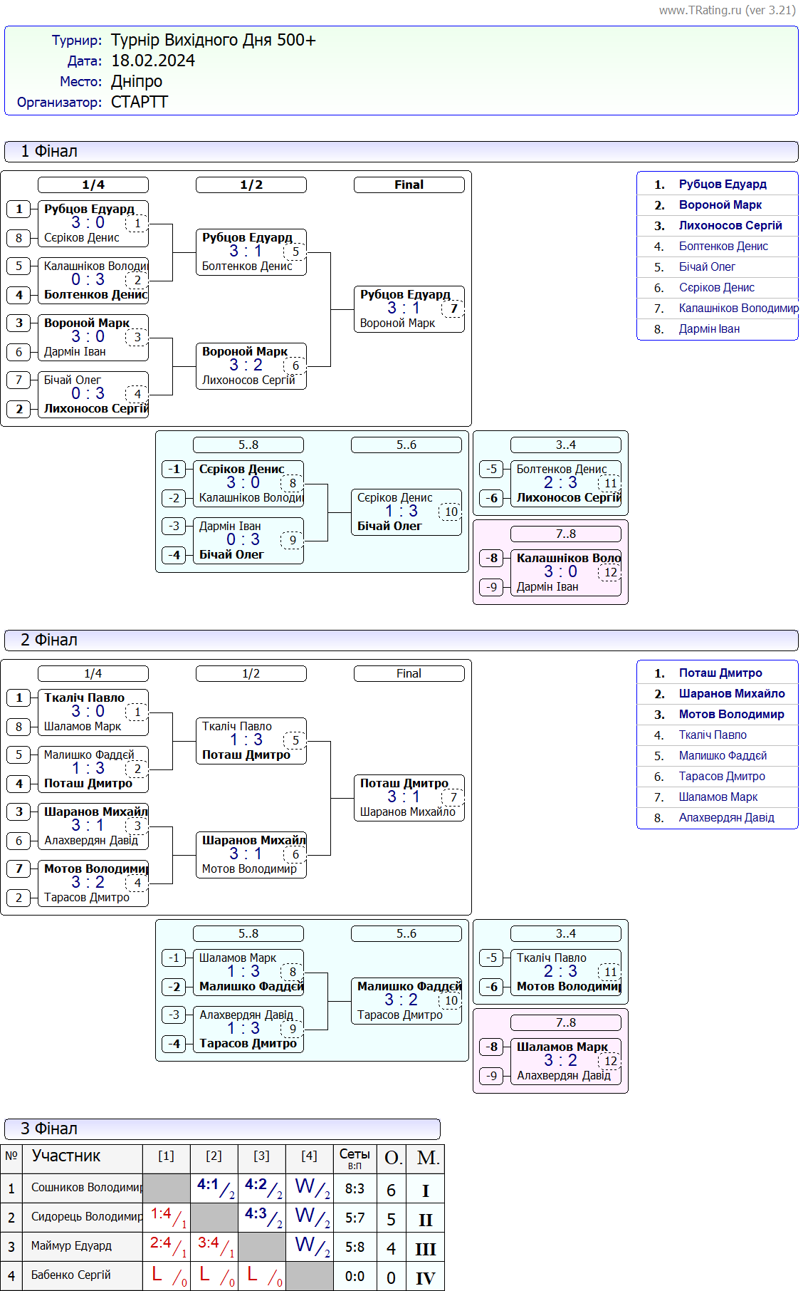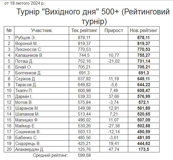Результати турніру “Вихідного дня 500+ (Рейтинговий турнір)” за 18.02.2024