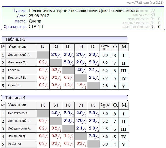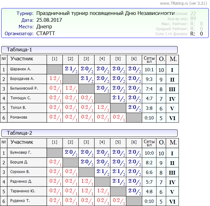 Вашему вниманию результаты второго праздничного турнира посвященному Дню Независимости Украины, 25.08.2017г