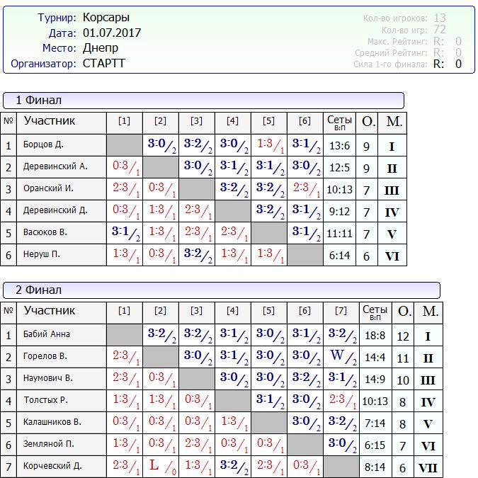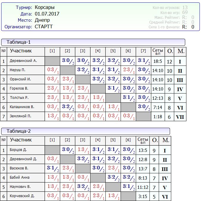 Вашему вниманию результаты турнира Корсары от 01.07.2017г