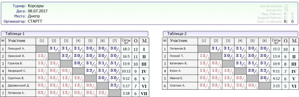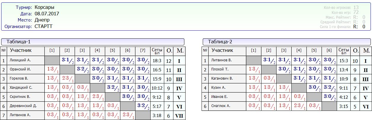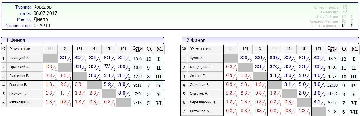 Вашему вниманию результаты турнира Корсары от 08.07.2017г