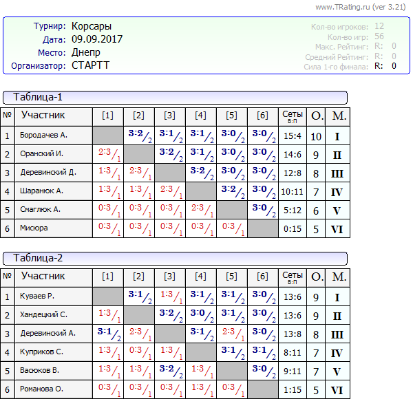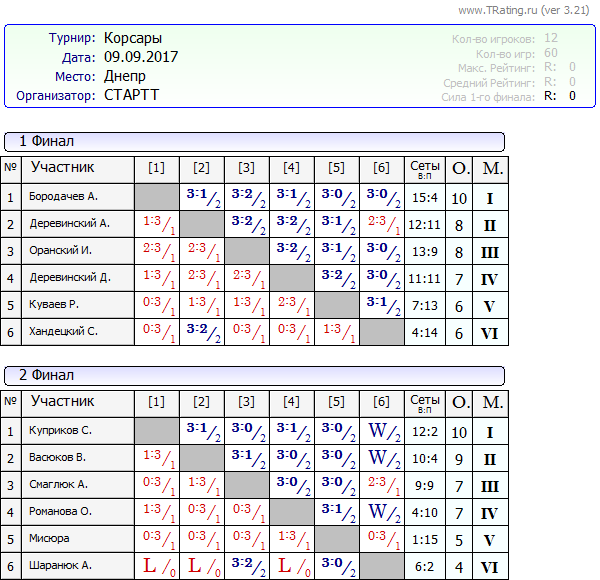 Вашему вниманию результаты турнира Корсары от 09.09.2017г