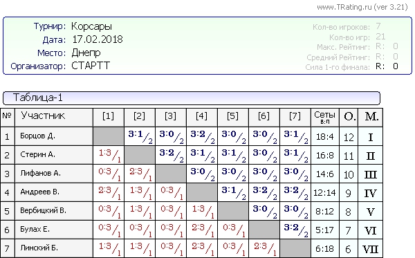 Вашему вниманию результаты турнира Корсары от 17.02.2018г