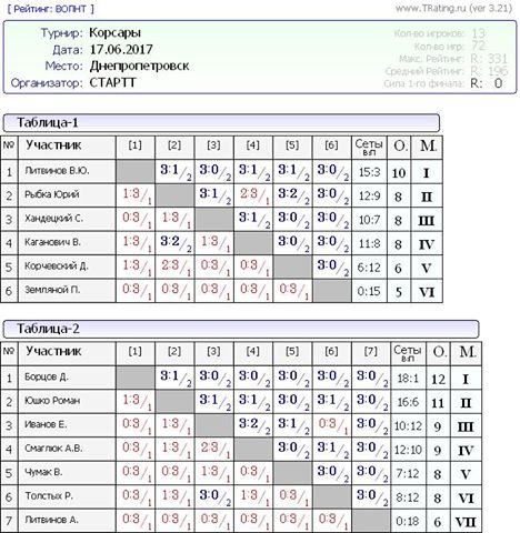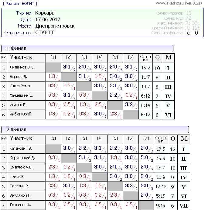 Вашему вниманию результаты турнира Корсары от 17.06.2017г