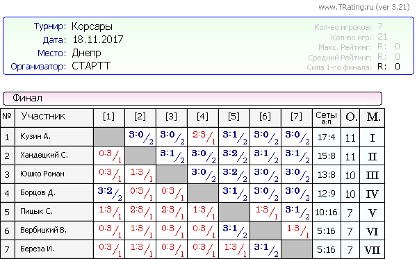 Вашему вниманию результаты турнира Корсары от 18.11.2017г
