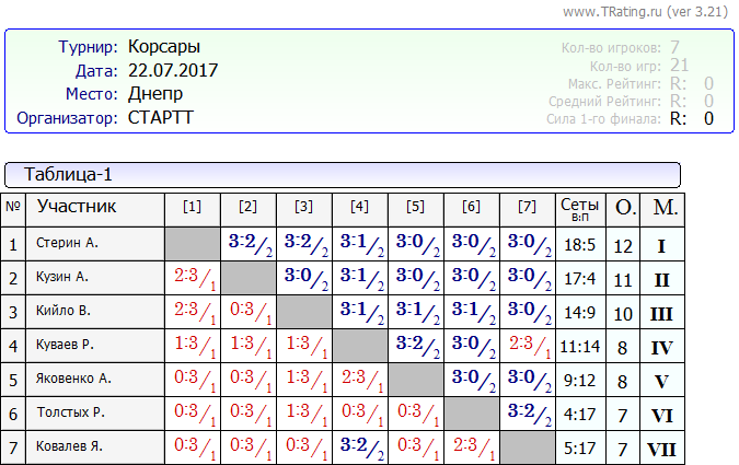 Вашему вниманию результаты турнира Корсары от 22.07.2017г