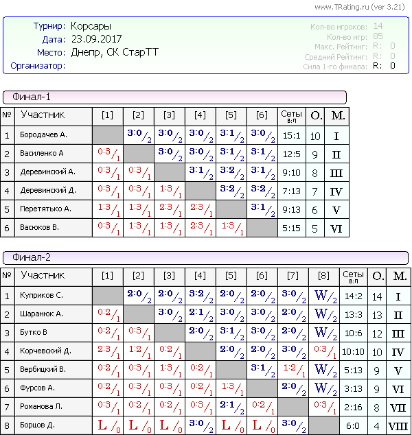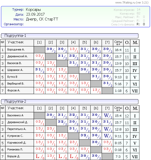 Вашему вниманию результаты турнира Корсары от 23.09.2017г