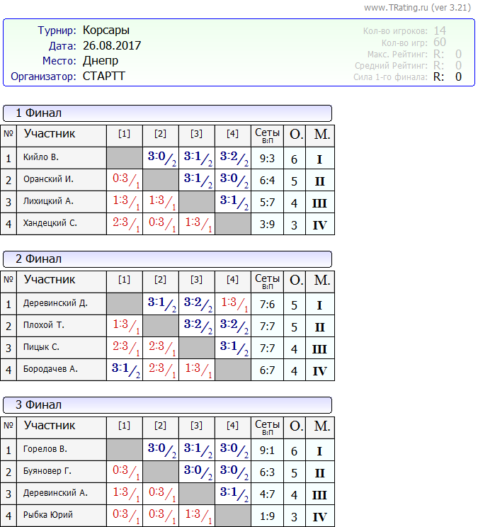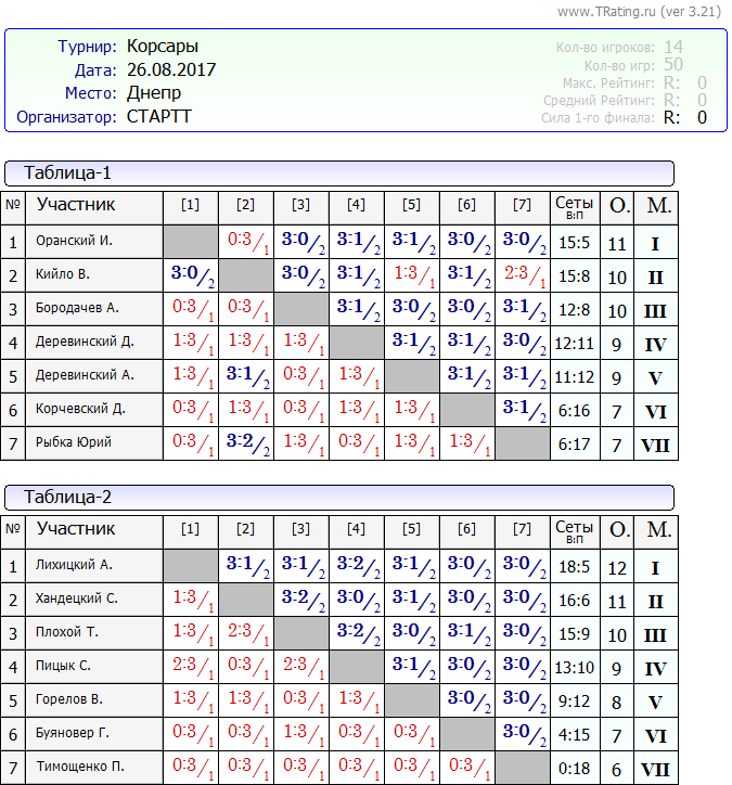 Вашему вниманию результаты турнира Корсары от 26.08.2017г