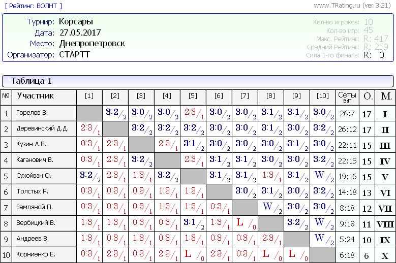 Вашему вниманию результаты турнира Корсары от 27.05.2017г