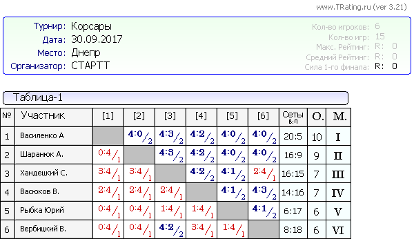 Вашему вниманию результаты турнира Корсары от 30.09.2017г