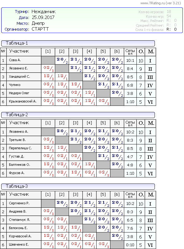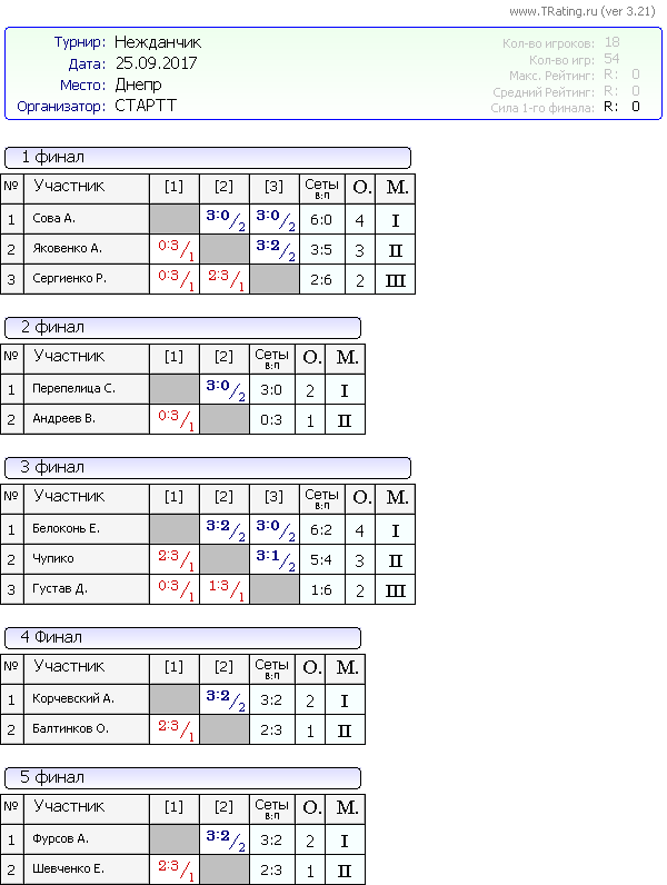 Результаты турнира Нежданчик от 25.09.2017 г
