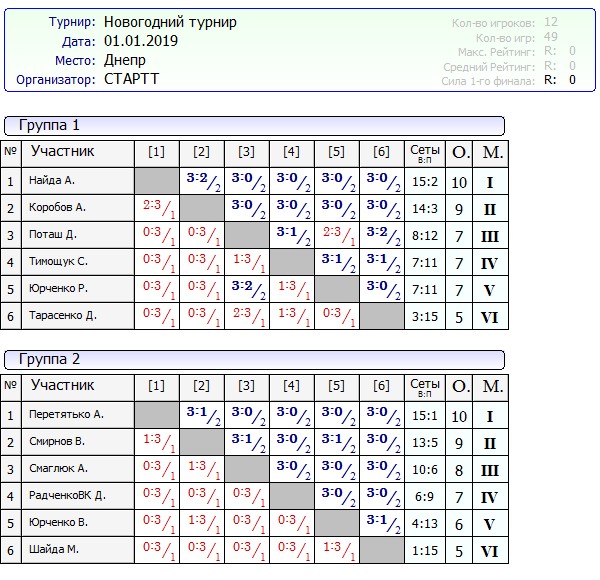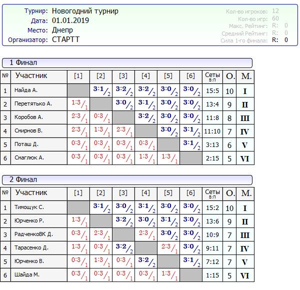 Результаты праздничного Новогоднего турнира от 01.01.2019 г