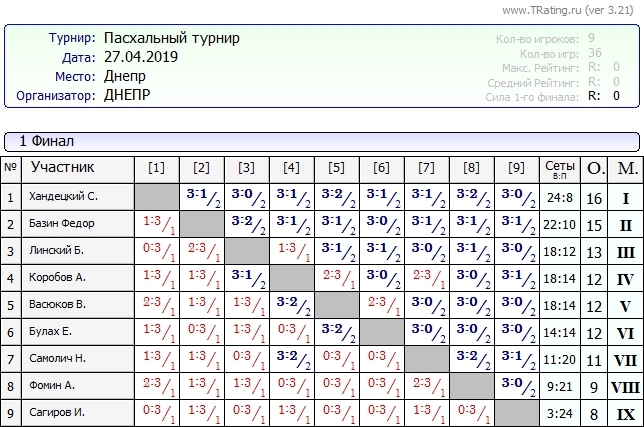 Результаты Пасхального турнира от 27.04.2019г