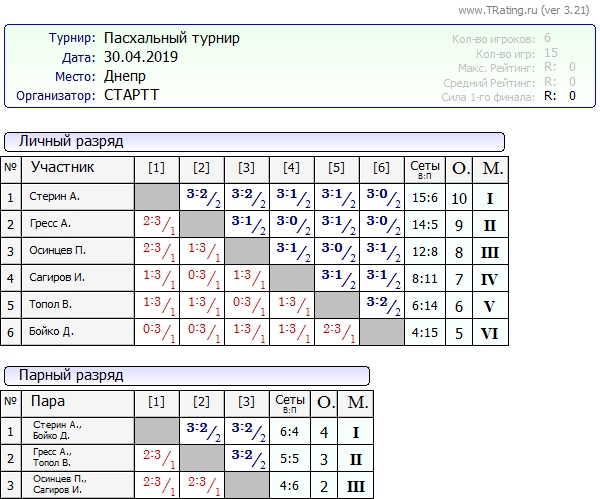 Результаты Праздничного турнира от 30.04.2019г