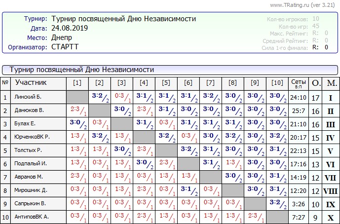 Результаты праздничного турнира от 24.08.2019г