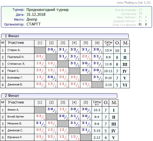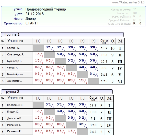 Результаты праздничного Предновогоднего турнира от 31.12.2018 г