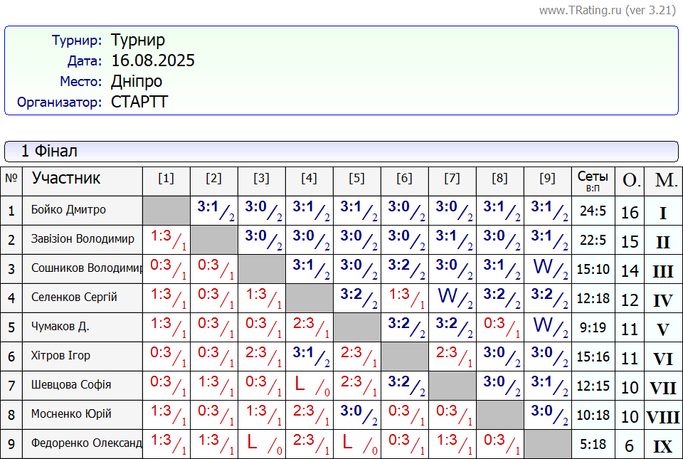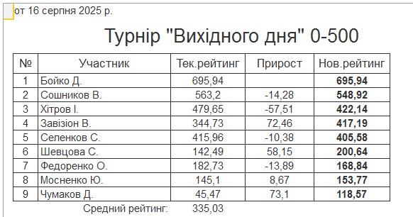 Результати турніру “Вихідного дня 0-500” за 16.08.2025