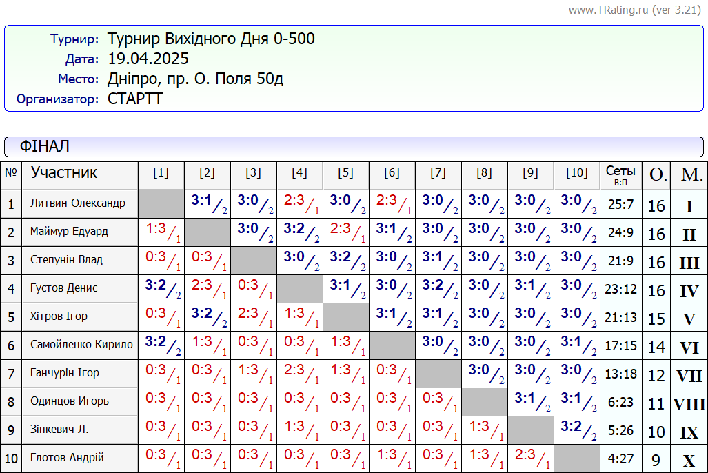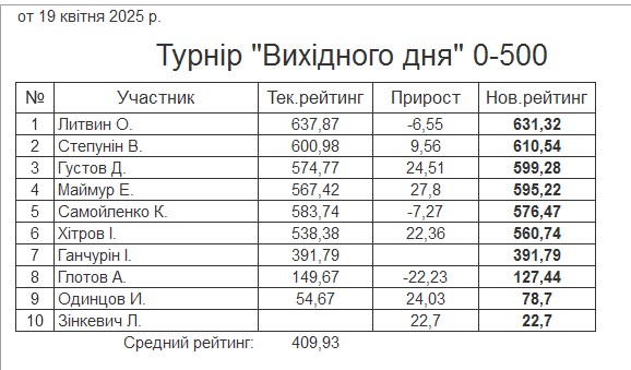 Результати турніру “Вихідного дня 0-500” за 19.04.2025