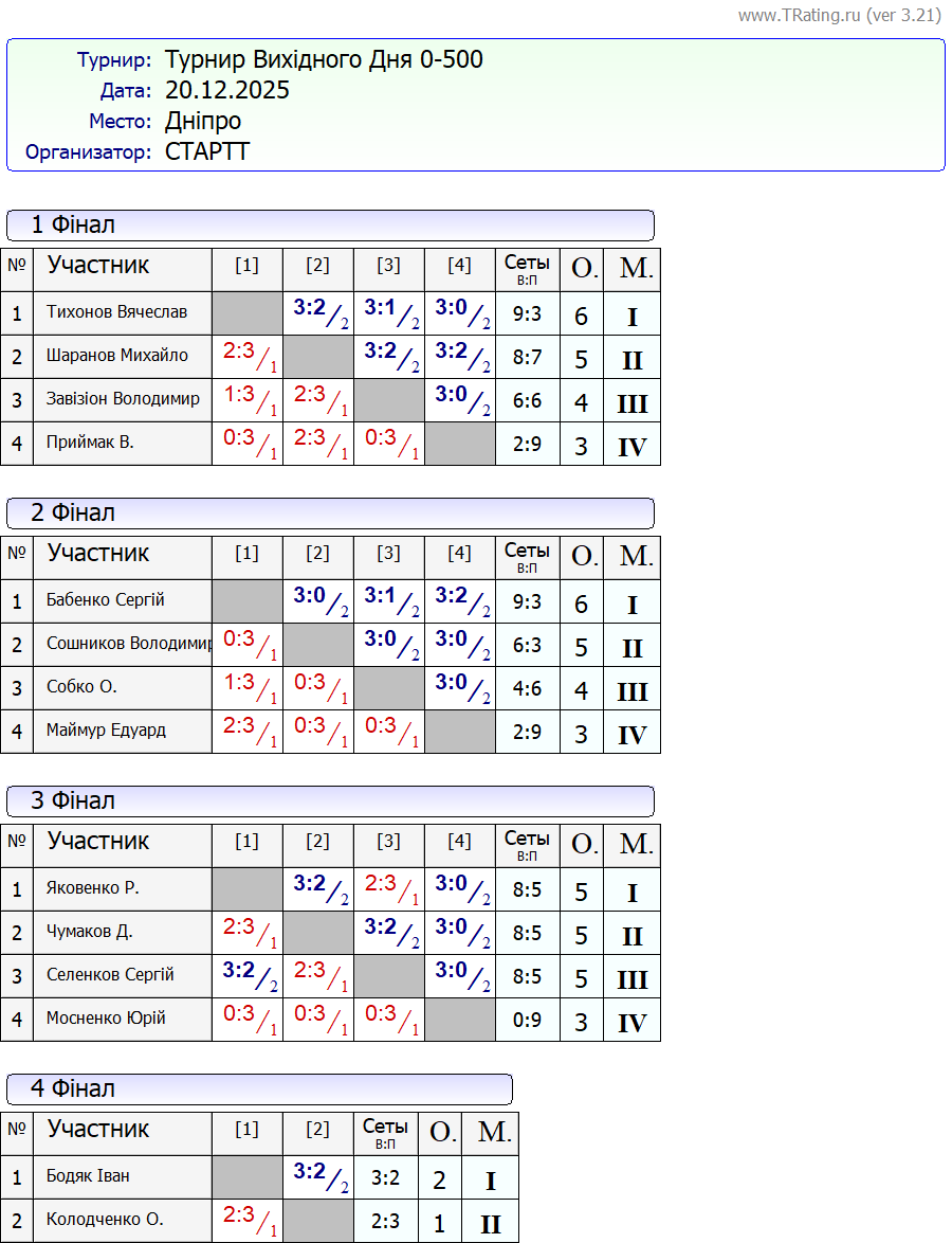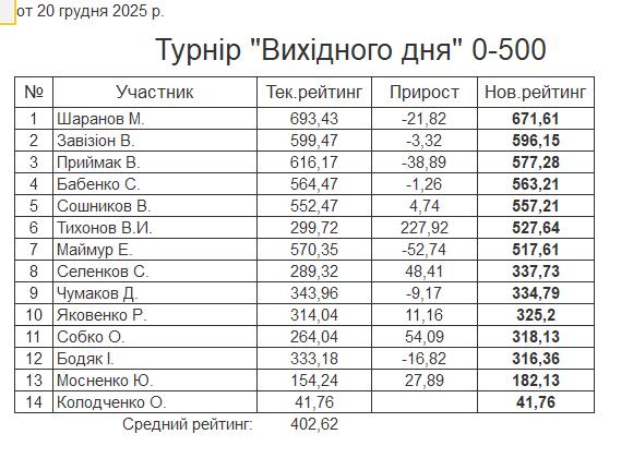 Результати турніру “Вихідного дня 0-500” за 20.12.2025