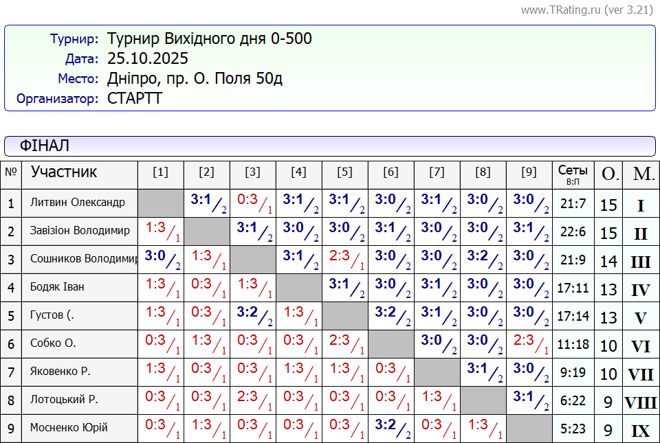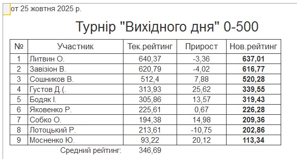 Результати турніру “Вихідного дня 0-500” за 25.10.2025