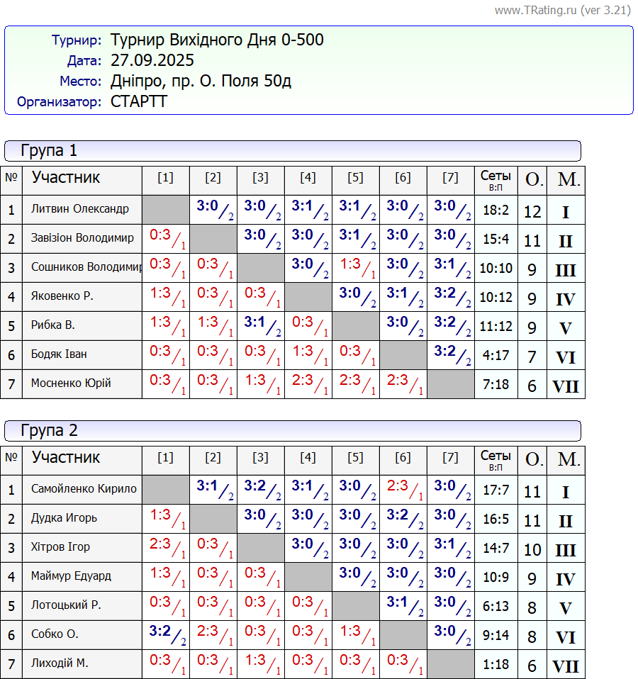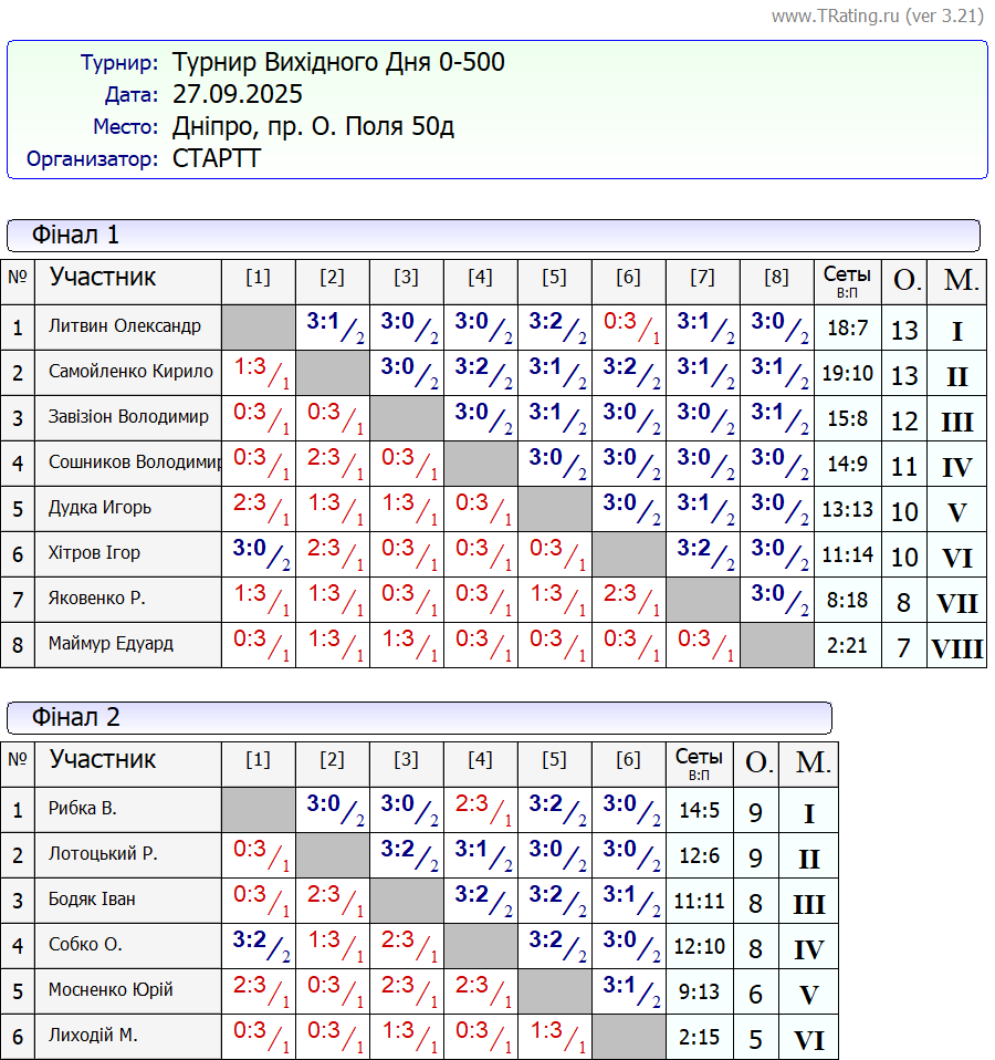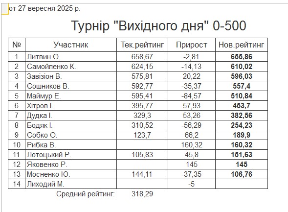 Результати турніру “Вихідного дня 0-500” за 27.09.2025