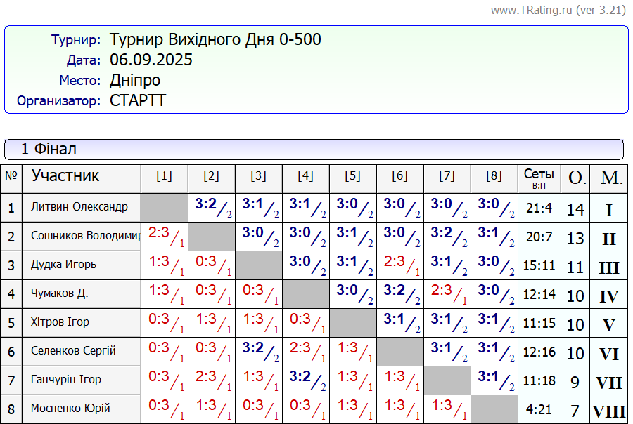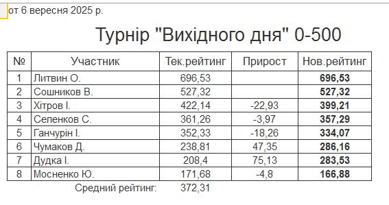 Результати турніру “Вихідного дня 0-500” за 06.09.2025