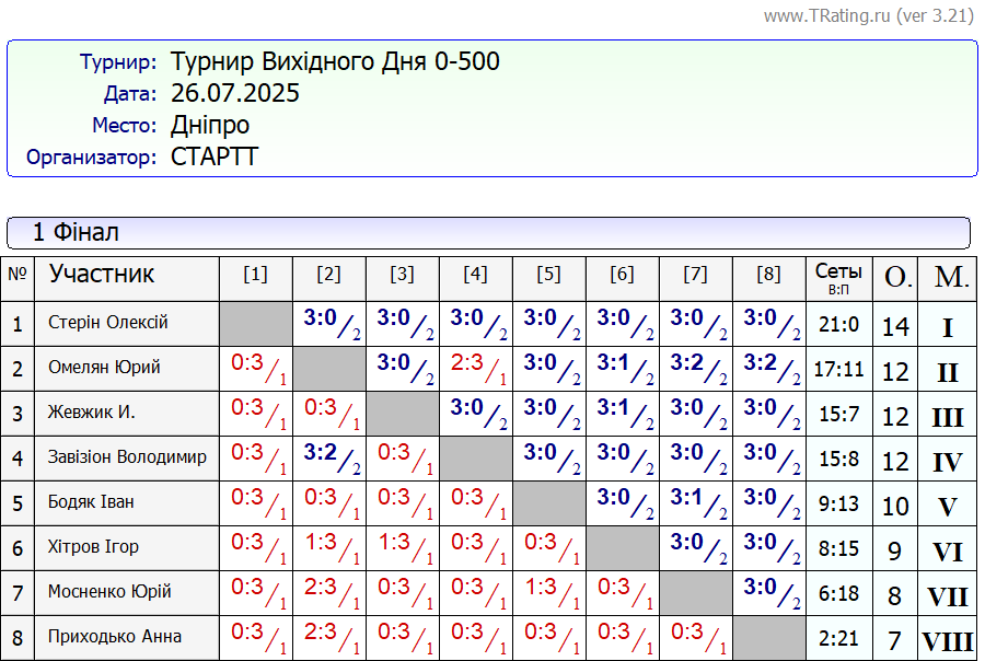 Результати турніру “Вихідного дня 0-500” за 26.07.2025