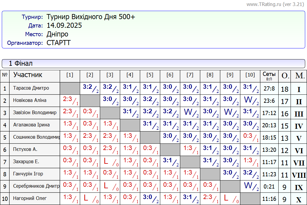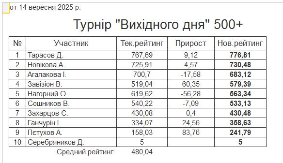 Результати турніру “Вихідного дня 500+” за 14.09.2025