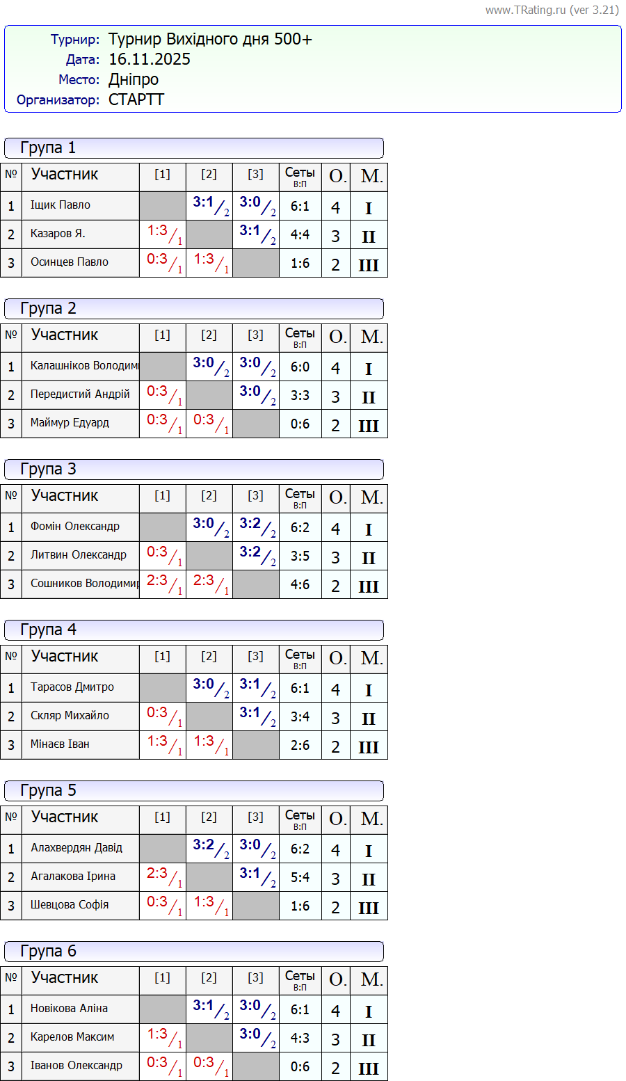 Результати турніру “Вихідного дня 500+” за 16.11.2025