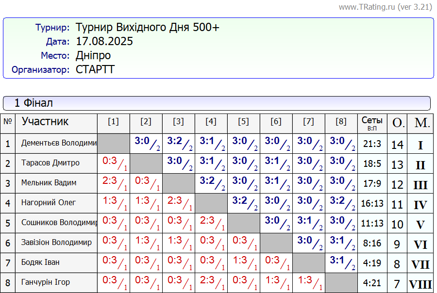 Результати турніру “Вихідного дня 500+” за 17.08.2025