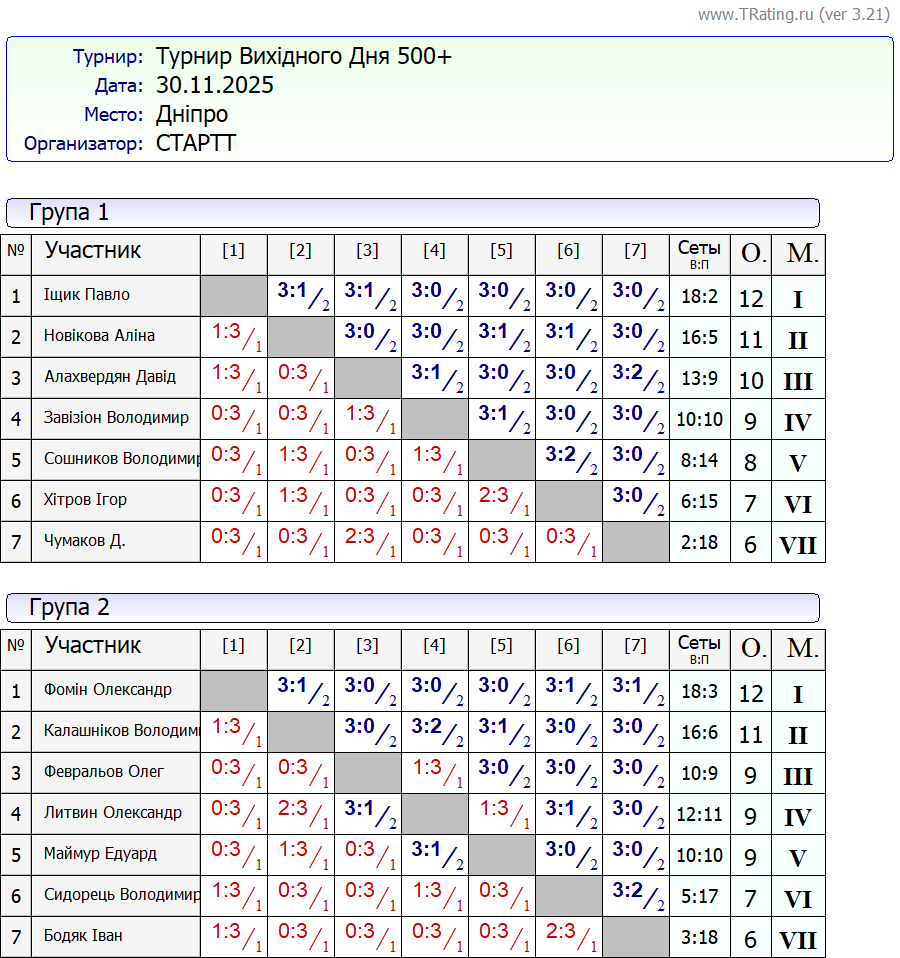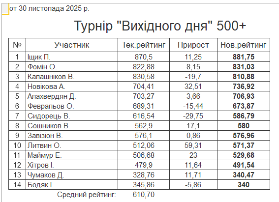 Результати турніру “Вихідного дня 500+” за 30.11.2025