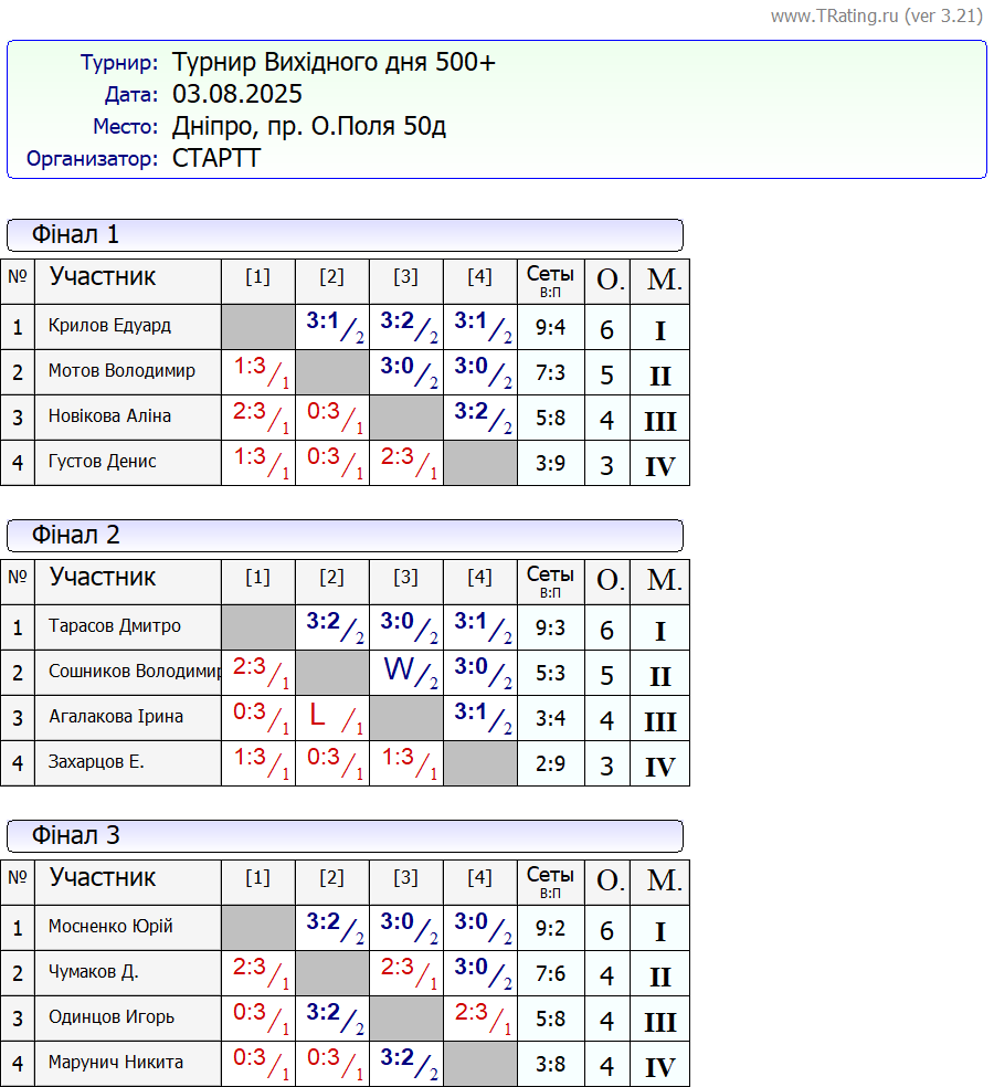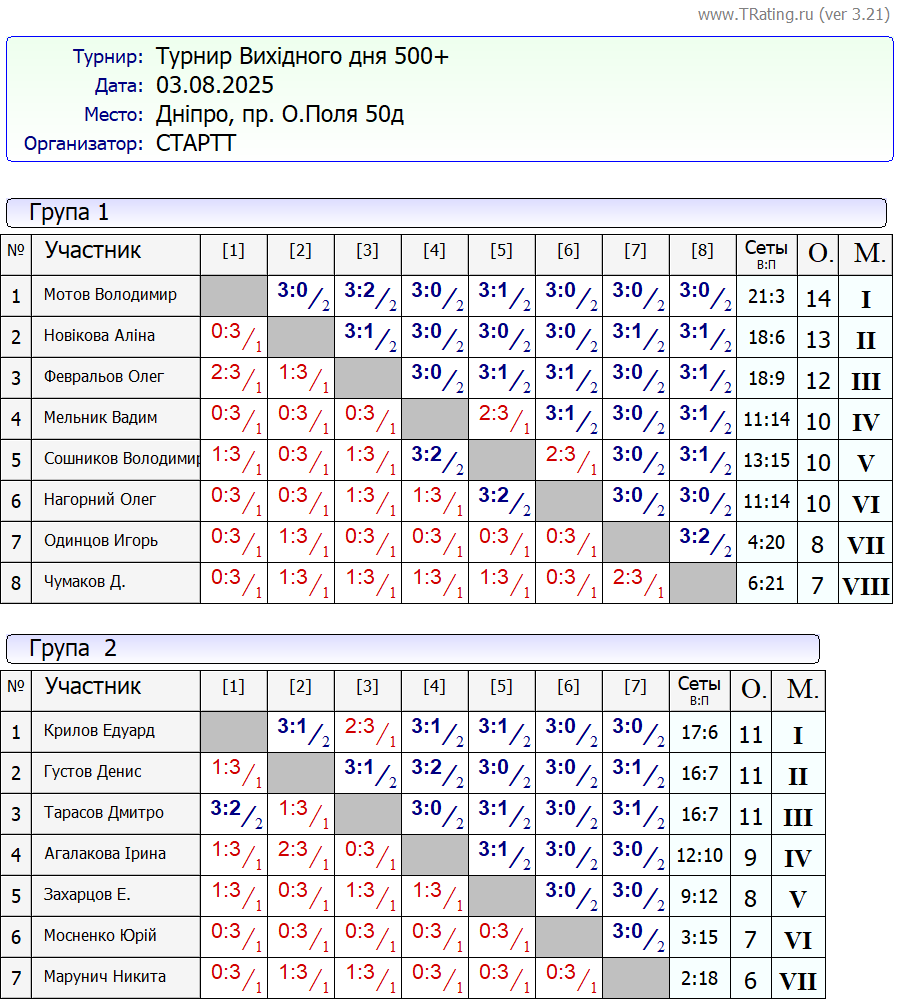 Результати турніру “Вихідного дня 500+” за 03.08.2025