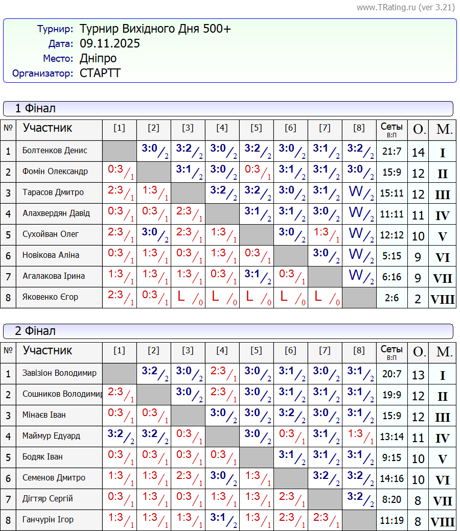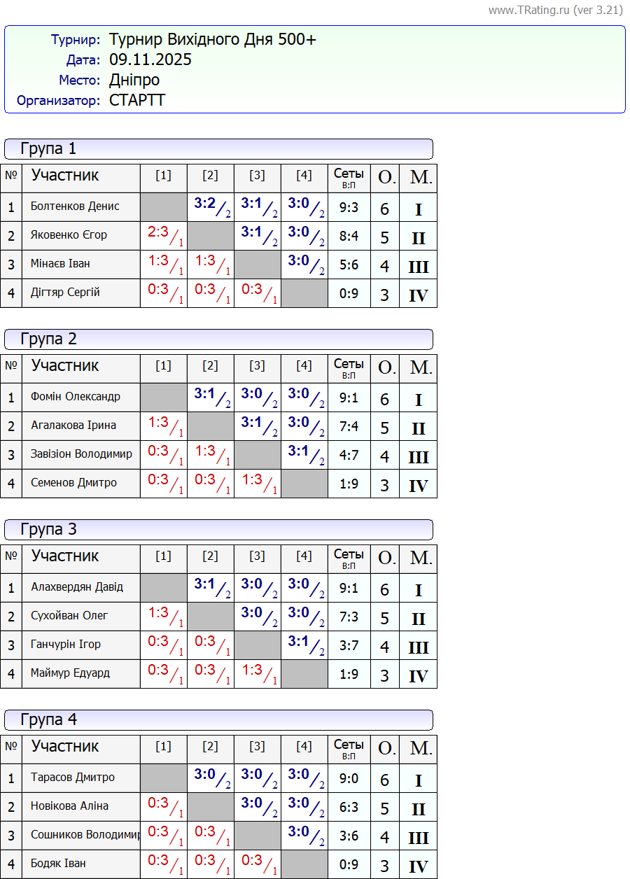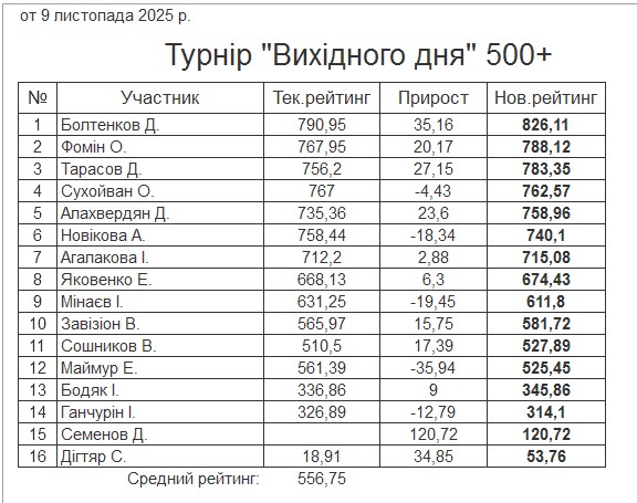 Результати турніру “Вихідного дня 500+” за 9.11.2025