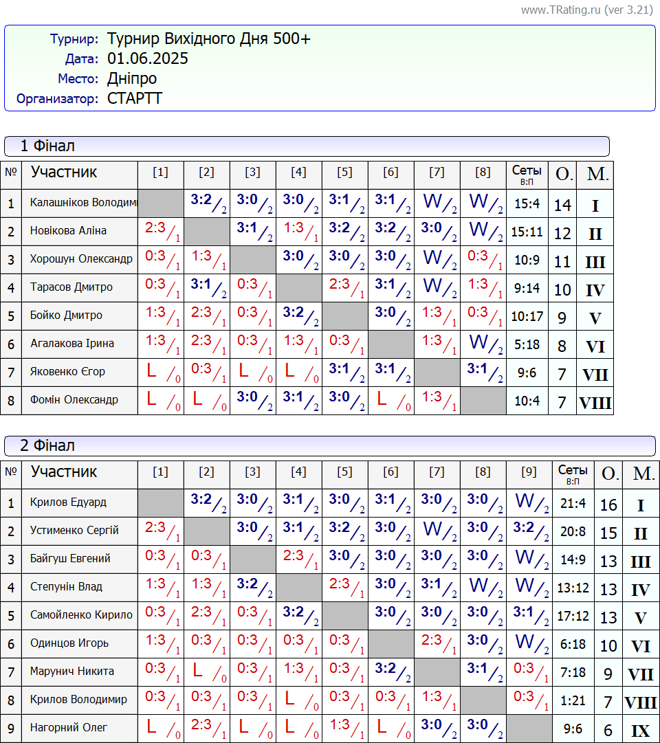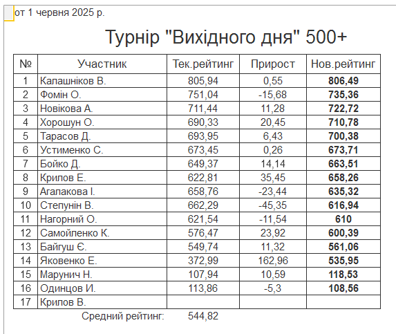 Результати турніру “Вихідного дня 500+” за 1.06.2025
