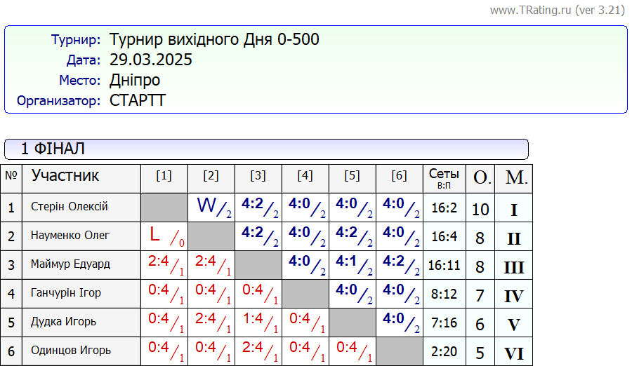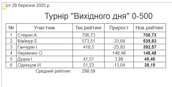 Результати турніру “Вихідного дня 0-500” за 29.03.2025