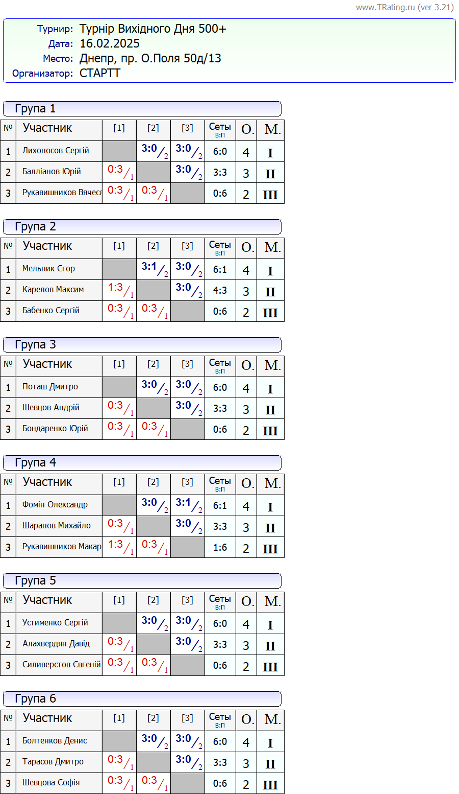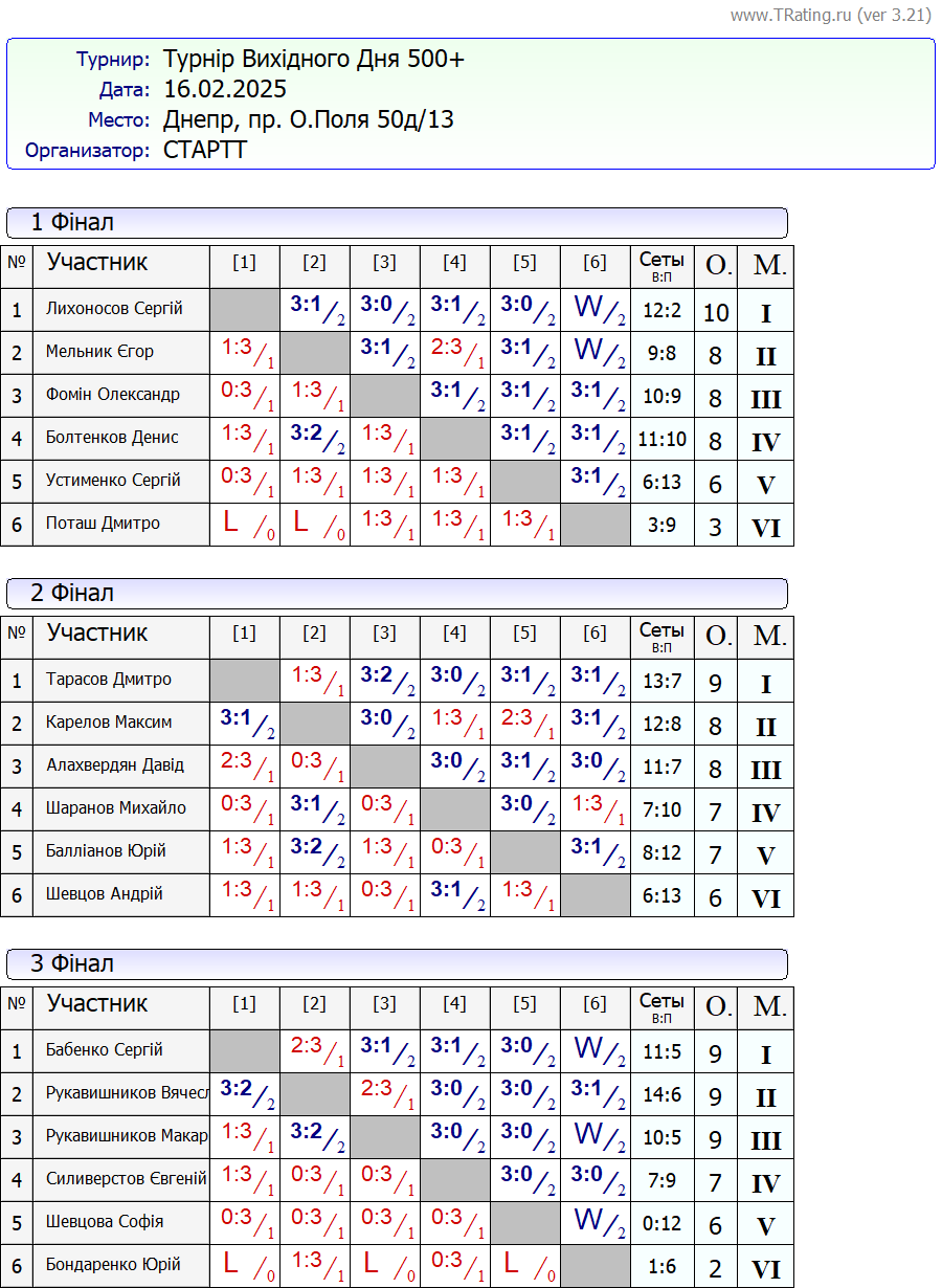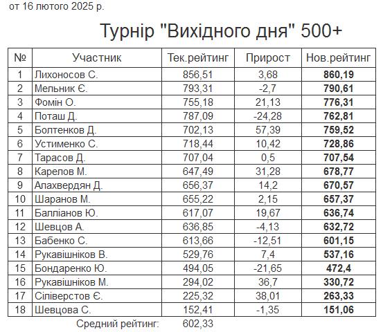 Результати турніру “Вихідного дня 500+” за 16.02.2025