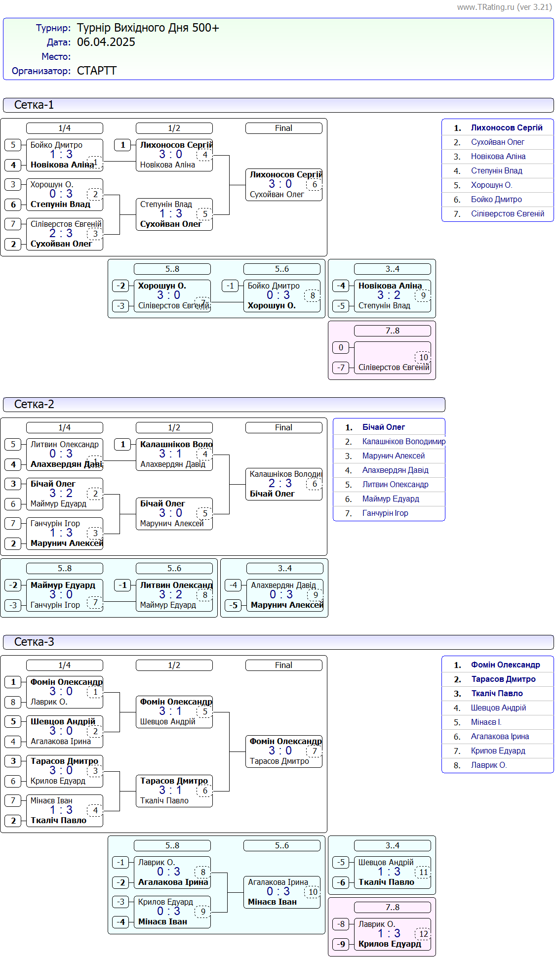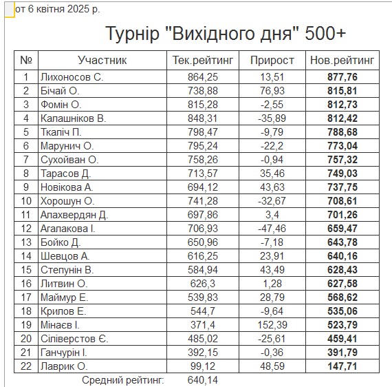 Результати турніру “Вихідного дня 500+” за 6.04.2025