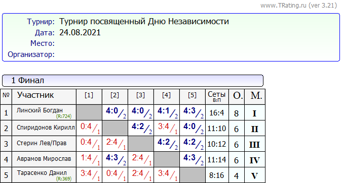 Результаты Турнира посвящённому Дню Независимости