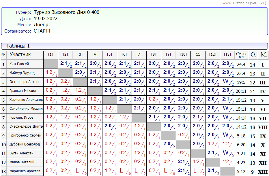 Результаты Турнира “Выходного Дня 0-400” за 19.02.2022