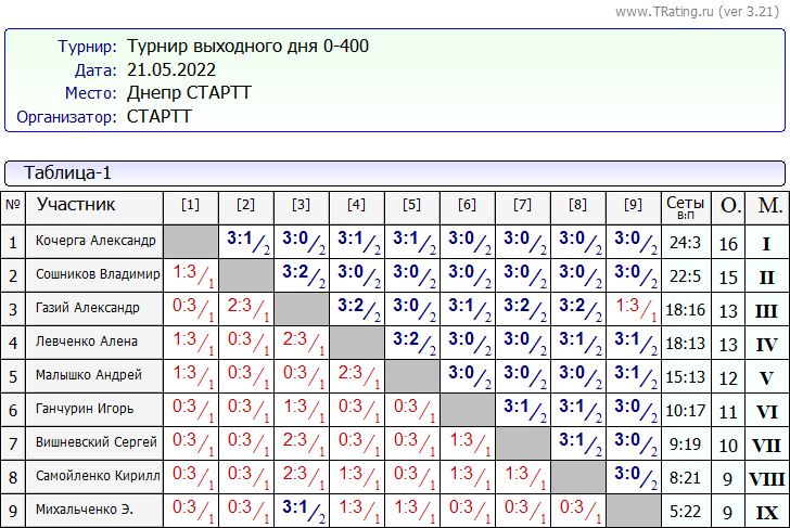 Результаты Турнира “Выходного Дня 0-400” за 21.05.2022