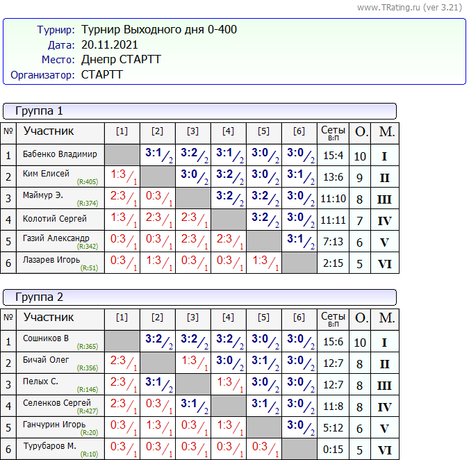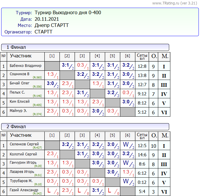 Результаты Турнира “Выходного Дня” 0-400 за 20.11.2021