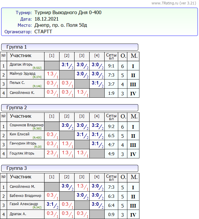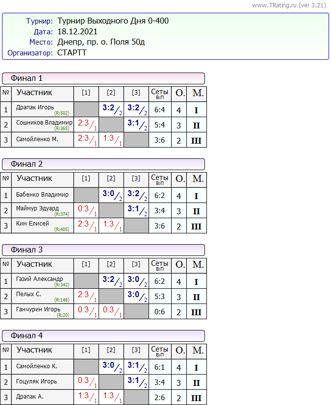 Результаты Турнира “Выходного Дня” 0-400 за 18.12.2021