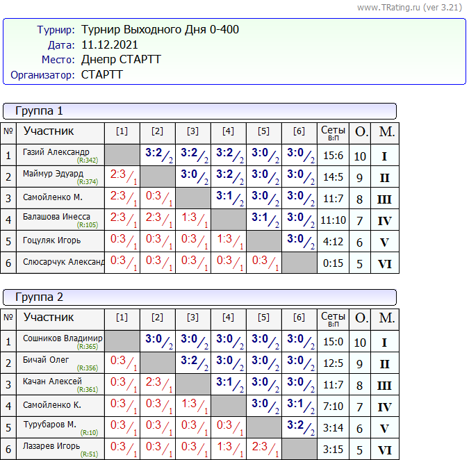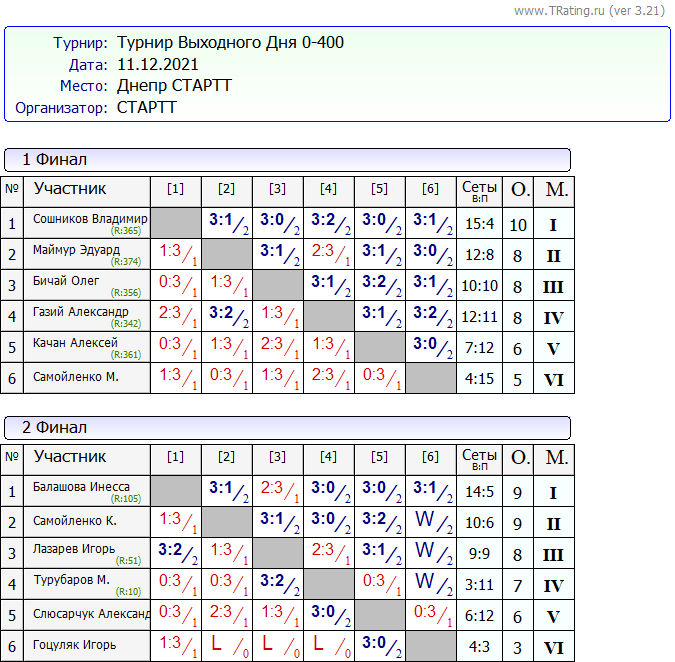 Результаты Турнира “Выходного Дня” 0-400 за 11.12.2021