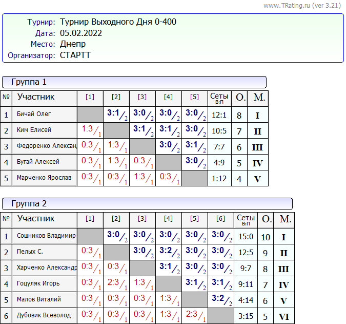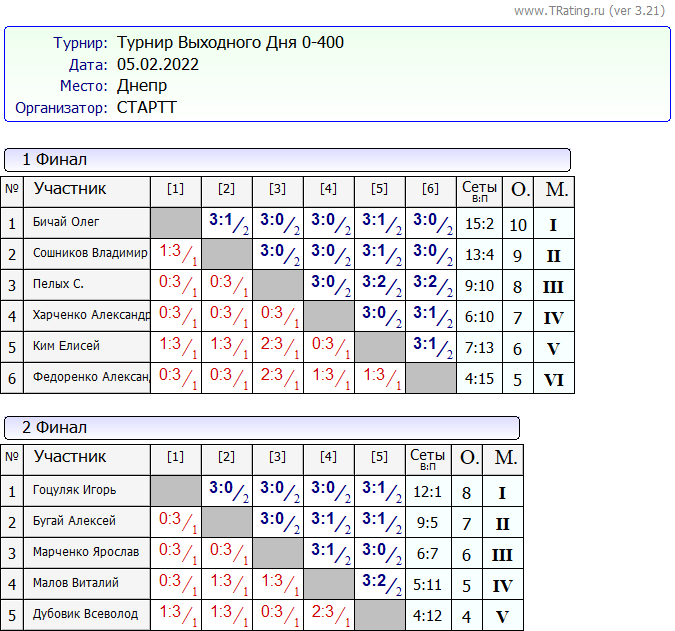 Результаты Турнира “Выходного Дня 0-400” за 05.02.2022
