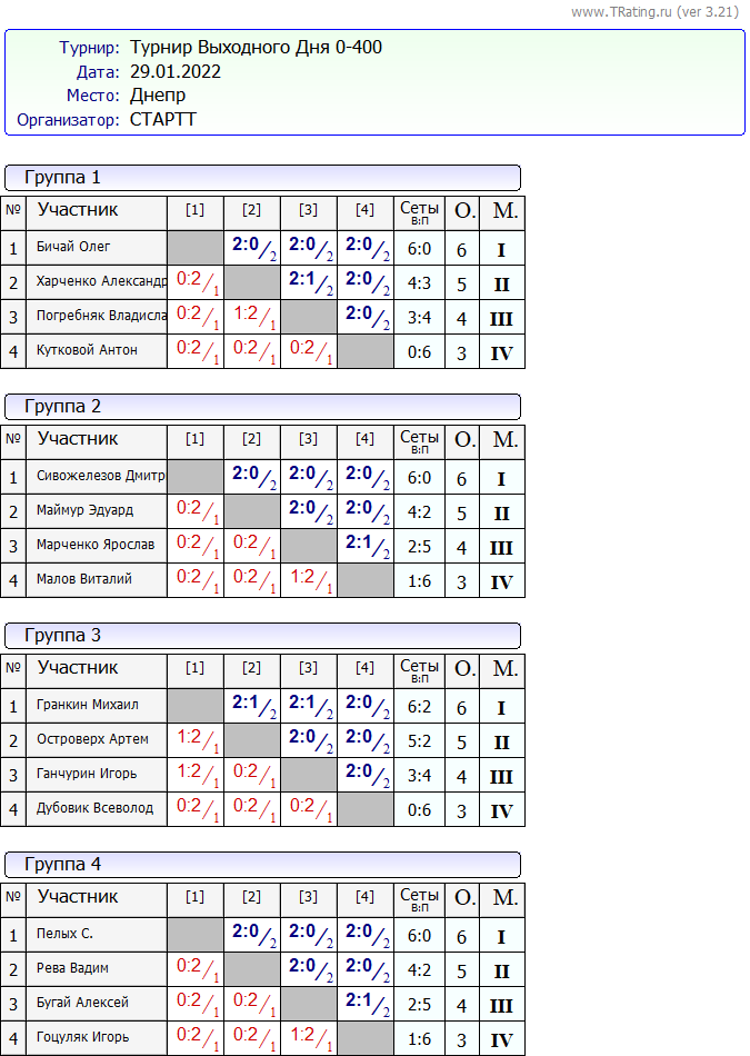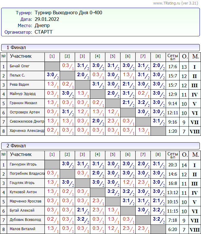 Результаты Турнира “Выходного Дня 0-400” за 29.01.2022