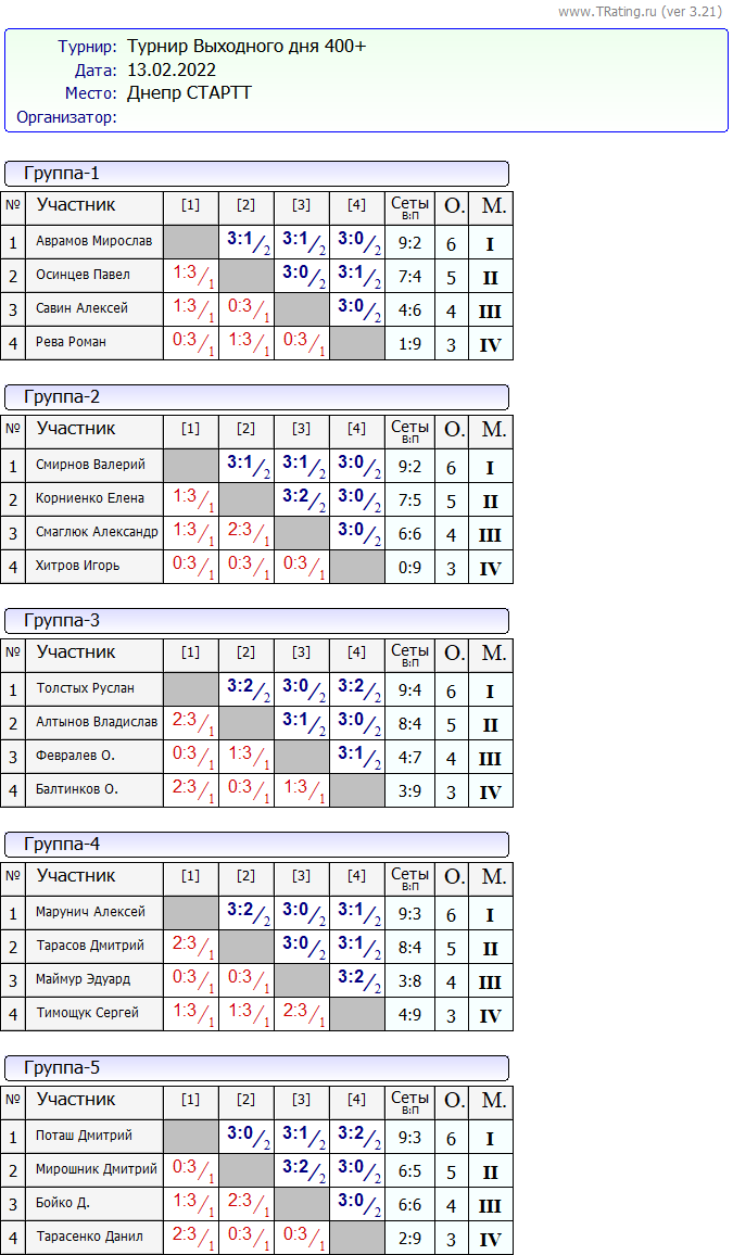 Результаты Турнира “Выходного Дня 400+” за 13.02.2022